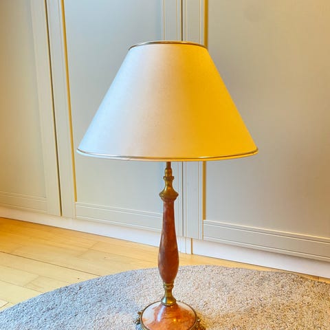 Smuk retro lampe i porcelæn eller fajance med messing fod. Med smukke blå glasur detaljer.