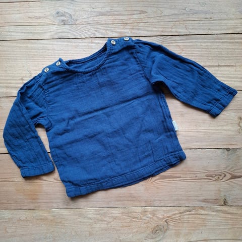Bluse, Okker Gokker Organic bluse , Okker Okker organic, str. 104, Sød lilla bluse med lidt mere lyselilla elastik kant, og en knap ved halsen; stram i modellen: