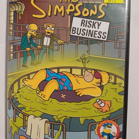 The Simpsons Risky Business DVD featuring episodes from the animated TV series. The DVD includes special features such as a music video and cast interviews. The cover shows characters from the series in a humorous scene.