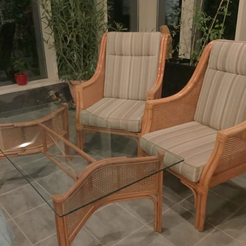 Ovalt bord med 6 stole, rundt bord med 2 stole. Reol. Alt i bambus. Samlet pris 700