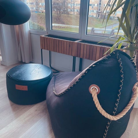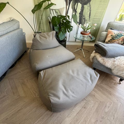 Meget bekvemmelig og alt, hvad en loungestol skal være: hård og blød, ædel og kælen. Med megaknapperne bagpå kan ryglænet justere. Det groft vævede stof er elegant, afslappet og superstærkt.