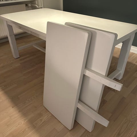 Fremstår utroligt flot uden brugsspor, men trænger til en klud med koldpresset linolie. Bordet er u/tillægsplader.