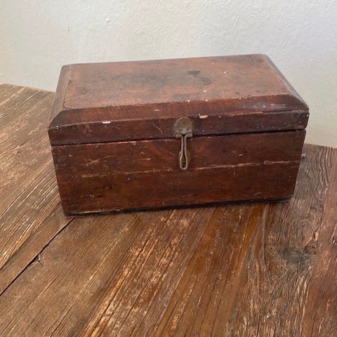 Trækasse som ligner et hus. Der er fint mønster. Der er 4 rum til nips, smykker eller måske makeup. Der er et hulrum, hvor der kan ligge en lyskæde. Måler 18 x 24 x 24.