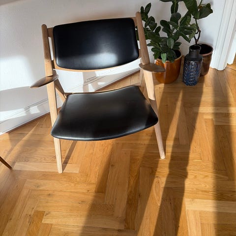 Jeg har denne stort set ubrugte CH28P H J Wegner stol. Den er i massiv eg med en lækker dyb blå læder.