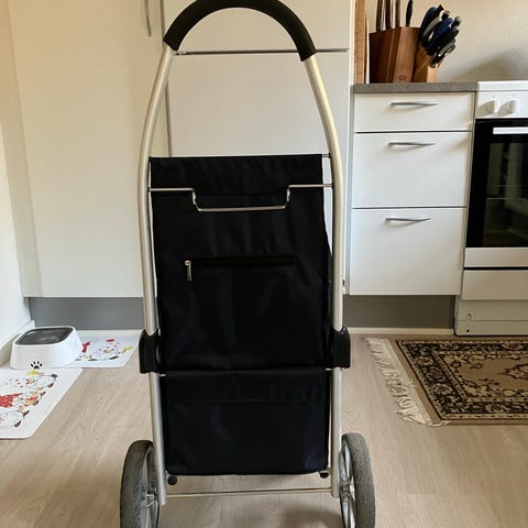 MOON Indkøbsvogn i sort farve med hjul. Tasken er rummelig og designet til nem transport af varer. Materialet er slidstærkt, og vognen har en praktisk lukning med snor. Velegnet til dagligvareindkøb og transport. Totalhøjde 92 cm, bredde 34 cm, dybde 20 cm.