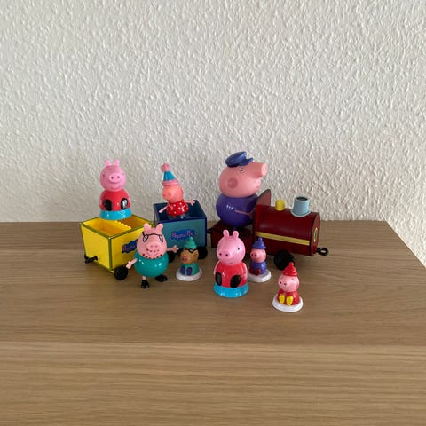 Gurli Gris-Tog. Legetøj med figurer i plastik, inkluderer et tog med tre vogne og fem figurer fra Gurli Gris- serien. (Bedstefar Gris sidder fast på toget).