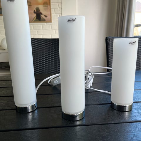 Herstal bordlampe i hvid med to lamper med tilhørende pærer, som kan justeres. Oplader har revne bagpå men uden betydning. Fungerer perfekt.