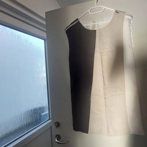 64 cm fra hals og ned, falder pænt ved hals og ned, har luk ved ærmer.