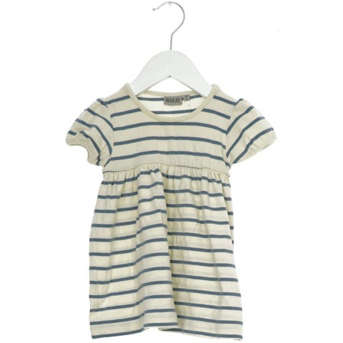 Denne kjole til børn fra Wheat er brun med hvide prikker. Den har lange ærmer og en rund halsudskæring. Kjolen har en løs pasform med et skørt, der er lidt rynket under brystet. fremstår som ny.