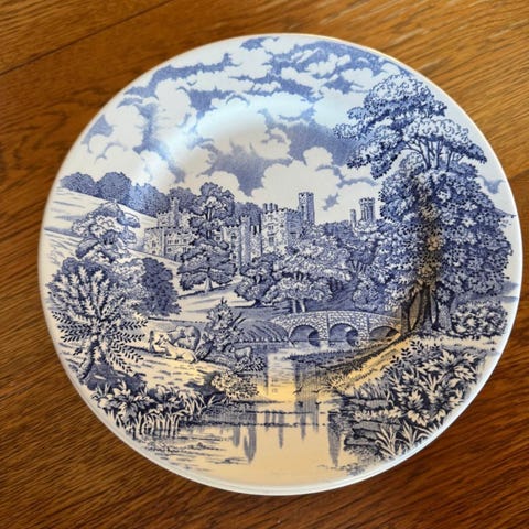 12 kage tallerkner i lys fajance med blådekoreret slotsmotiv.
