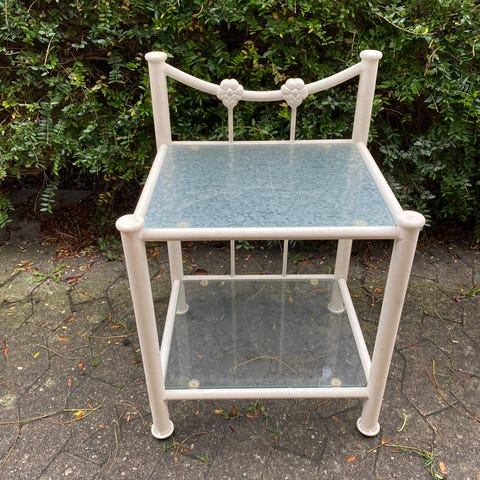 Manilla sengeborde. Meget velholdte. De to hvide sælges enkeltvis, mens det sorte bord kun sælges sammen med de to hvide borde. Pris pr. stk. for de hvide 450 kr.