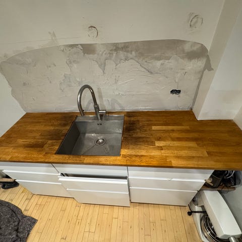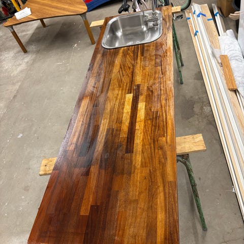 Er nedtaget d.d. Massiv træbordplade inkl. stålvask uden armatur. Er plejet med olie, men trænger til en slibning.