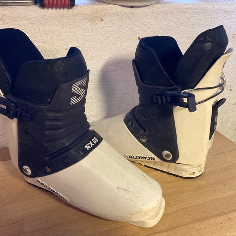 Salomon skistøvler i sort og lilla farve, størrelse 48. Skistøvlerne er designet til at give støtte og komfort under skiløb. Materialet er robust og egnet til vintersport.