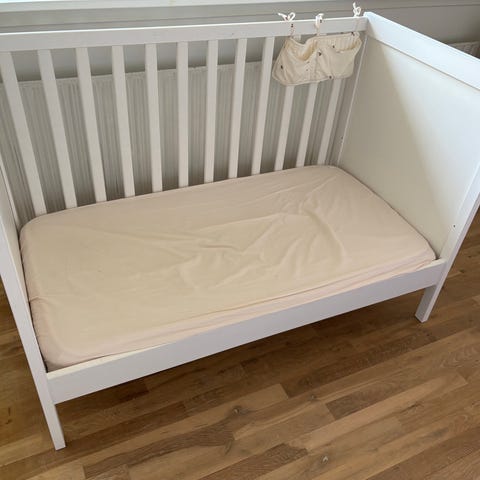Fin hvid tremmeseng i god stand. Madras og rullemadras medfølger.
