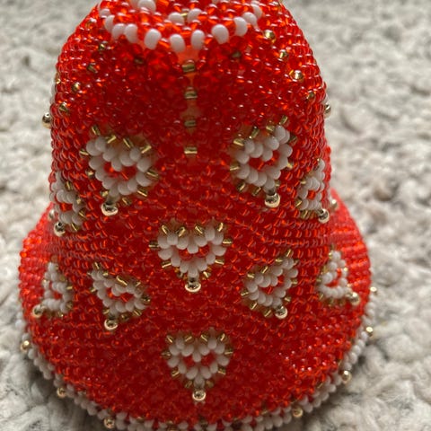 Håndlaget perlebrodert Juleklokkei rød og hvit farge med hjerte- og geometrisk mønster. Juleklokken har lange bånd til ophængning. Dekorativ Julepynt. Højde 15 cm, Diameter 14 cm.