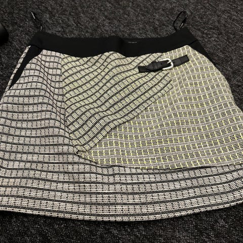 Elegant Karen Millen nederdel med et iøjnefaldende geometrisk mønster i forskellige nuancer af blå, sort og hvid. Nederdelen har en smuk, figursyet pasform og en fin flæsekant forneden, der tilføjer et feminint touch. Perfekt til både hverdag og festlige lejligheder.