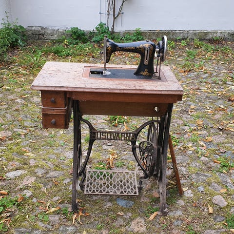Husqvarna symaskine med bord i træ og metalstel. Maskinen er mekanisk med fodpedal og har et klassisk design. Velegnet til syning af tekstiler og hobbyprojekter.