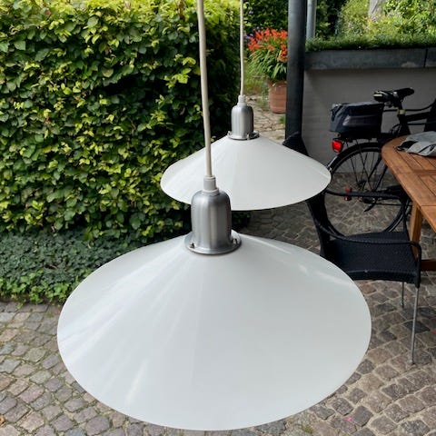 Lamperne fremstår flot, sælges med almindelige brugsspor, der er dog et lille anslag/meget lille bule i skærmen på den ene lampe, hvilket jeg har taget et foto af (kan måske skimtes på de sidste to billeder i annoncen).