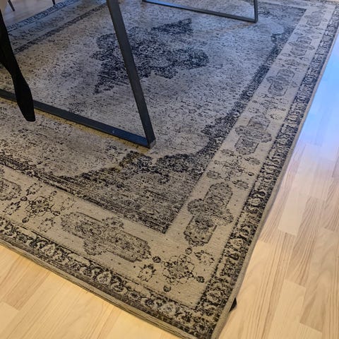 Venus tæppe med målene 200x290 cm. Tæppet er fremstillet af bomuld og har en grå farve med et mønstret design. Velegnet til brug i boligindretning for at tilføje et dekorativt element til gulvarealet.