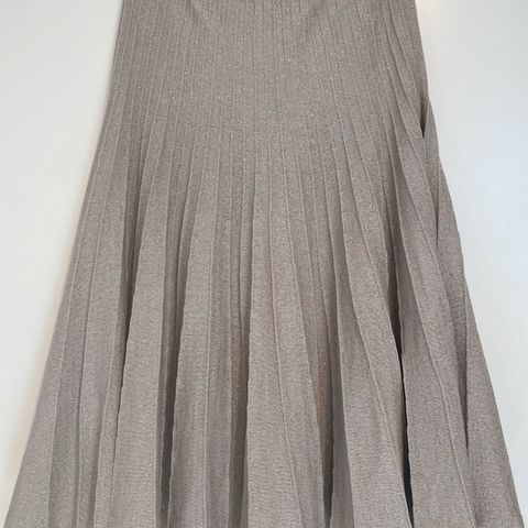 Flot gul, gylden plisse, plisseret midi nederdel. Har desværre fået tre mindre pletter i venstre side. Har ikke prøvet at fjerne dem.