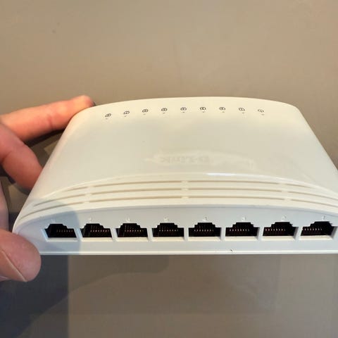 D-Link DES-1008D netværksswitch med 8 porte, modelnummer DES-1008D, farve sølv. Enheden bruges til at forbinde flere netværksenheder og understøtter 10/100 Mbps hastigheder. Leveres med strømforsyning.