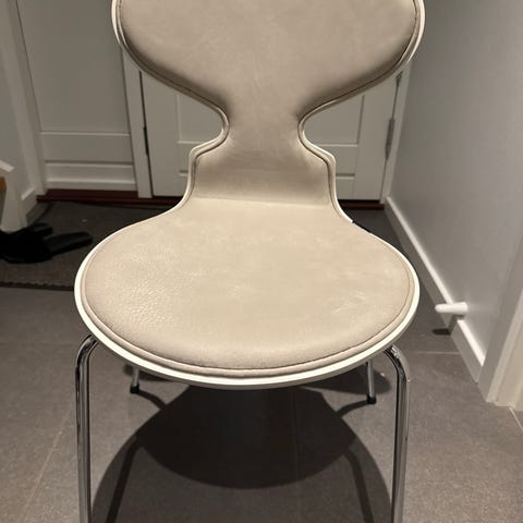 Fritz Hansen Arne Jacobsen Model 3107 spisebordsstol med hvid lakeret formbøjet MDF og ben i forkromet stål.