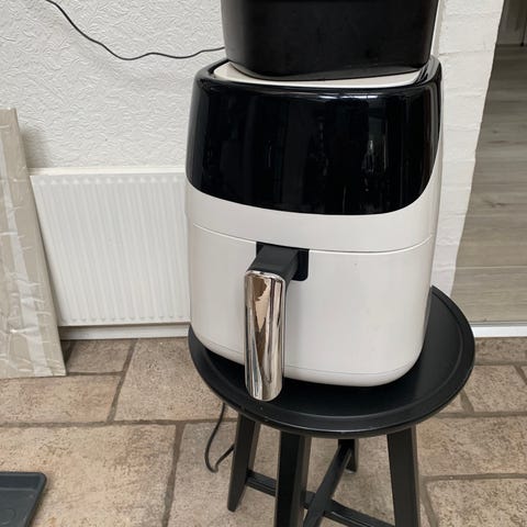 Super dejlig fryer med god plads til feks en hel kylling eller flæskestegen. Den har supergode anmeldelser og er blevet nr 1 i airfryer testen. Laver pragtfuldt mad på ingen tid. Den ene skuffe lukker ikke helt til ( se billedet) men det har ingen betydning for madlavningen. Fungerer upåklageligt.