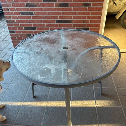 Udendørs bord med rund glasplade og sort metalstel. Bordet har et robust design med tre ben, der sikrer stabilitet. Glaspladen er gennemsigtig med en struktureret overflade. Velegnet til brug på altan eller terrasse.