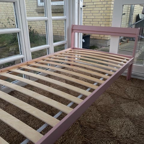 IKEA enkeltseng med træramme og lamelbund. Sengen har en hvid overflade og ben i metal. Inkluderer en madras med quiltet overflade. Sengen er egnet til enkeltpersoner og passer til standard enkeltsengsmadrasser.