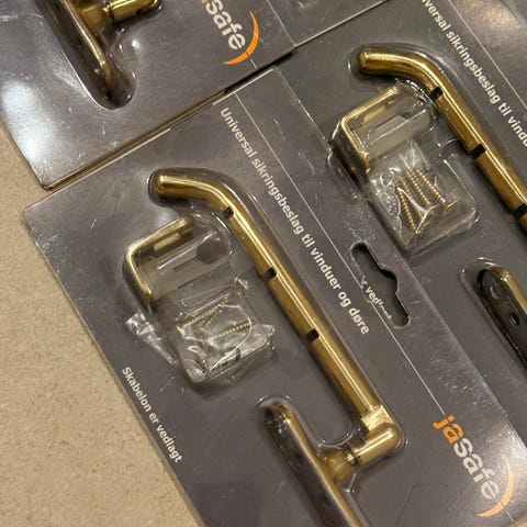 4 x Sikringsbeslag til døre og vinduer (el-forz gul) + 4 x Anverfer m/øsken (2 x el-forz gul + 2 x hvid) + 2 x stormkrog hvid