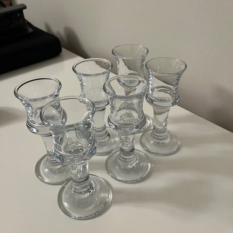 6 stk. snapseglas med snoet still, alle med "AALBORG AKVAVIT" trykt på. Højde ca. 16 cm. Plus 1 stk Aalborg akvavit juleglæden i guldtryk.