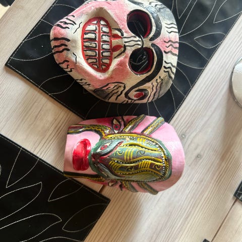 Super flotte Afrikansk træmasker udskåret ansigtstræk samt indgraveret dyremotiver. Farve brun/ orangerød. Højde 38.cm. Brede 21,5cm. Sælges for 400kr. stk.