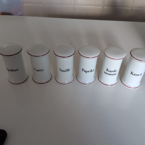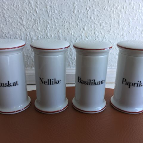 Bing & Grøndahl krydderiglas med låg i hvidt porcelæn. Sættet indeholder 9 forskellige glas.