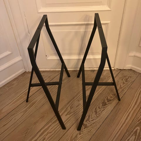 Uden Mærke Foldbar Arbejdsbukke 6 stk. i hvid metal. Arbejdsbukkene er foldbare og velegnede til støtte ved forskellige bygge- og renoveringsopgaver. De har en robust konstruktion og kan nemt opbevares eller transporteres på grund af deres foldbare design.