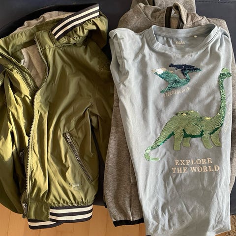 H&M multifarvet børnetøj i størrelse 140 til dreng. Sættet indeholder forskellige typer tøj med forskellige farver og mønstre, herunder en trøje med dinosaurmotiv. Tøjet er velegnet til daglig brug og leg.