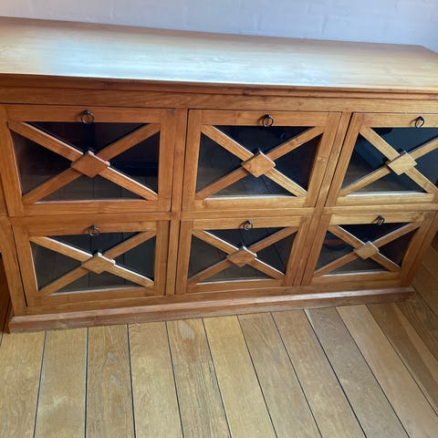 Trækommode med 13 skuffer i lyst træ. Kommoden har et naturligt træfinish og flere opbevaringsmuligheder fordelt på både små og store skuffer. Sælges pga. flytning