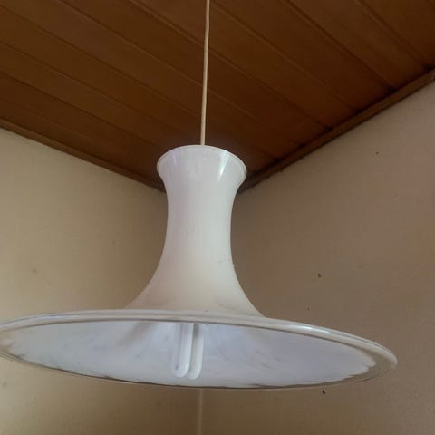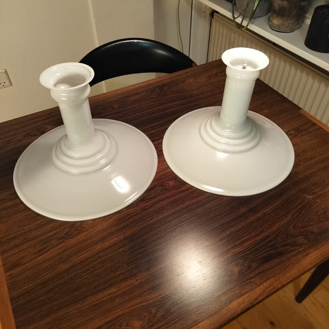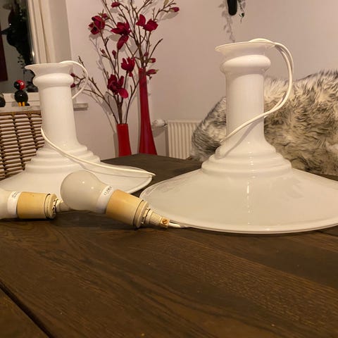 2 Holmegaard Mythos loftslamper på henholdsvis 36 cm og 48 cm. Brugte men stort set ingen brugsspor. Pris: 500,- for 38 cm og 700,- for 48 cm. Begge for 1.000,-