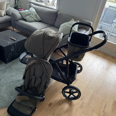 Cybex GAZELLE S Tvillingevogn/kombivogn/søskendevogn i kongeblå. Alt medfølger som vist på billeder; 2 klapvogne-sæder, 1 barnevognskasse og ståbræt til bror/søster. Derudover følger der regnsjal med. Varen kan afhentes i Hellerup.