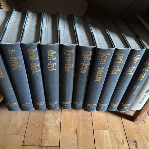 Sælger et komplet sæt af Bonniers Trebands Lexikon, udgivet i 1970 af Albert Bonniers Förlag, Stockholm.