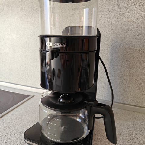 Fuldautomatisk med 2 kander, stor vandebeholder og flere valg for hastighed og vandmængde. Lynhurtig at lave kaffe på.