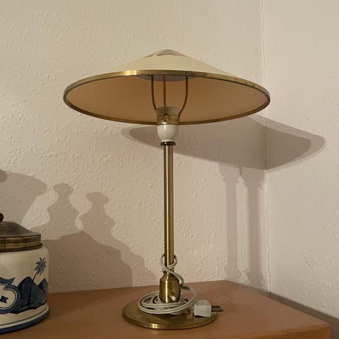 Lamperne er fra 1950,er købt på Lauritz den gang. Fremstår flot ,med patina, den ene har et knæk på skærmen, ses på billedet.
