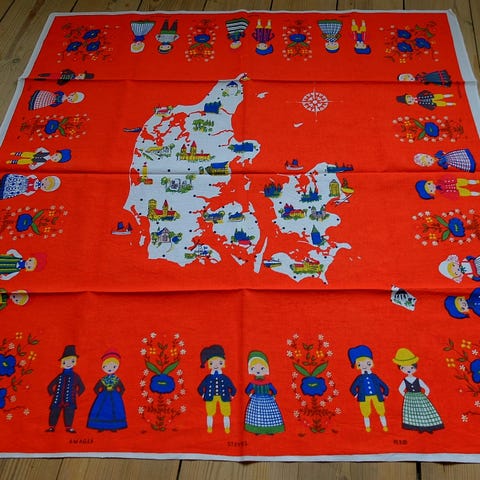 Et fint stykke gammel dug med danmarkskort i centrum og fine egnsdragter hele vejen rundt