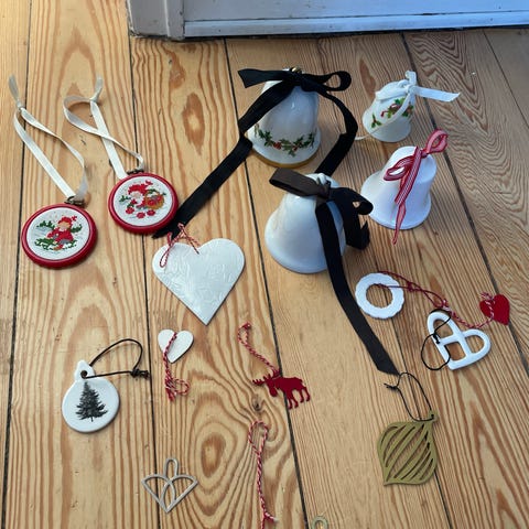 4 små træ klokker til ophæng og nisse i hus ophæng. Højde på klokker 3 cm.