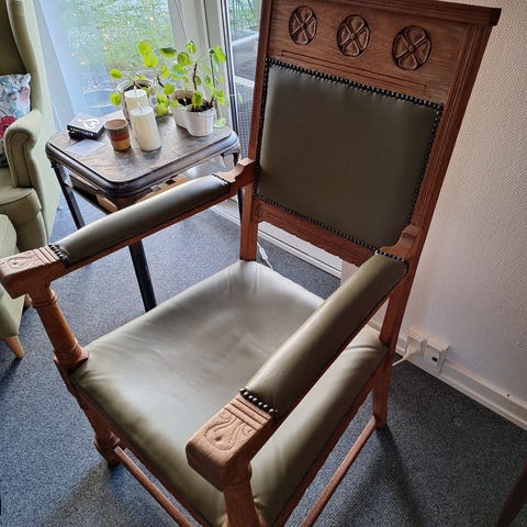 Emil Schmidt antik stol med brun læderpolstring og udskåret træramme. Stolen har dekorative søm langs ryggen og armlæn, samt detaljeret udskæring på ben og armlæn. Høj ryg og solid konstruktion. Velegnet til brug som spisestol eller dekorativ stol i hjemmet.