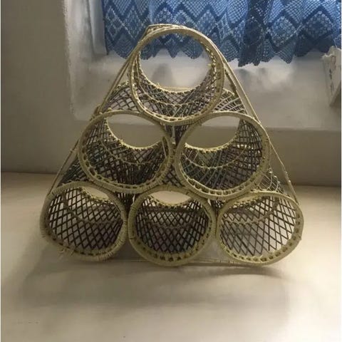 Lille vin / flaskereol i bambus / flet træ med plads til 12 flasker.