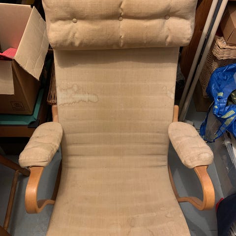 Bruno Mathsson- Pernilla lænestol med tilhørende fodskammel. Møblet er udført i lyst træ med råhvid uld polstring, der er tuftet med knapper. Lænestolen har buede armlæn og en justerbar nakkestøtte med læderstropper. Polstringen og trærammen fremstår med svage pletter, der kan ses på billederne. Dertil er den ene læder strop på armlænet gået i stykker, dette fremgår også at billed. Designet er karakteristisk for Bruno Mathssons funktionelle og komfortable møbler.
