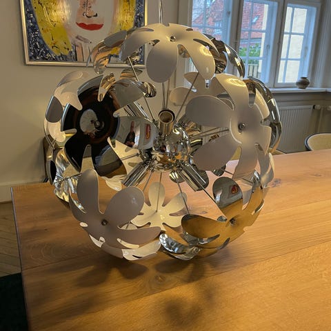 Stor dekorativ sputnik-inspireret loftlampe i krom.