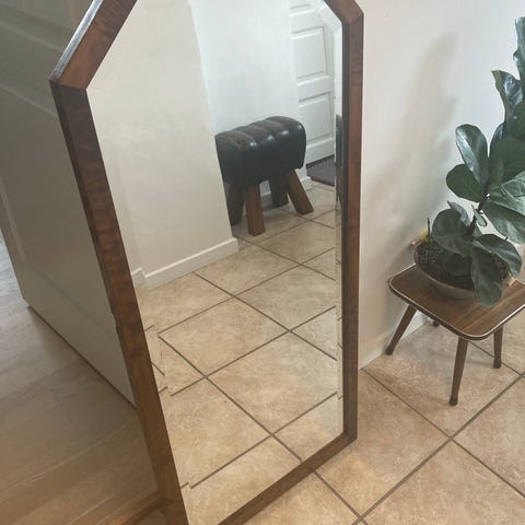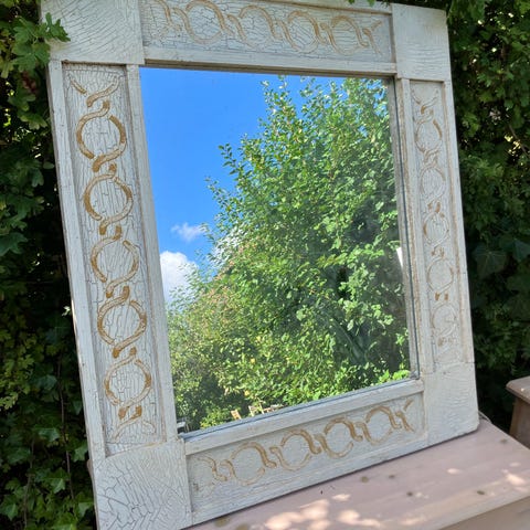 Fint spejl med blomsterranke, som kan stå på et bord. God stand. Mål 45 h. 35 b. Kan sendes mod du betaler fragten.