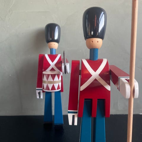 Kay Bojesen Postmand og Garder træfigurer i rød og blå farve. Figurenes beklædning er detaljeret med hhv. postmandens uniform og garderens uniform med hvide kryds på brystet. Materialet er træ, og figurerne har en stiliseret og enkel formgivning. Disse figurer er gamle og med Kay Boysen aftryk ( på benet). De sælges enkeltvis til 500 kr. eller 800 kroner for begge to . Disse figurer er samler objekter.