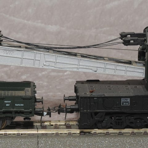 Märklin 7051 modelkran i HO skala. Modellen har en drejefunktion med elektromagnetisk løftefunktion. Fremstillet i metal. velegnet til modeljernbaneopstilling og samling.